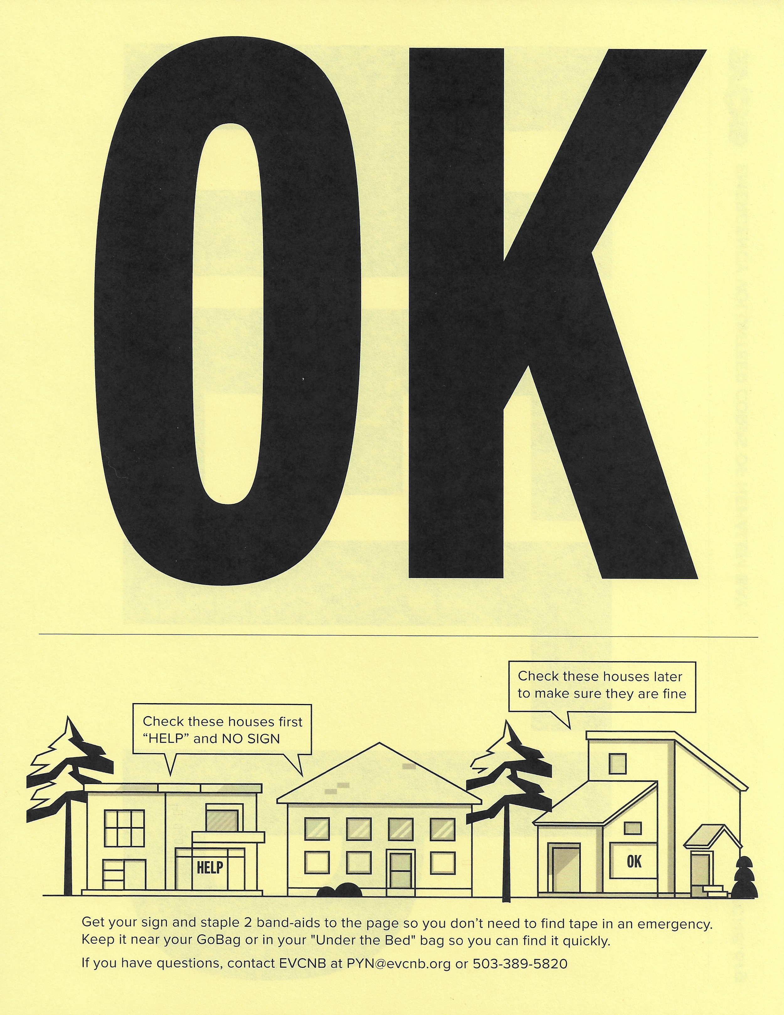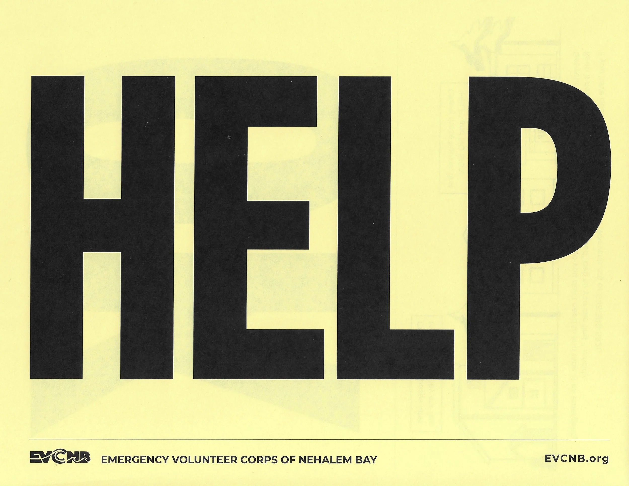 While you’re planning, do you have the bright yellow HELP/OK sign? These signs help emergency responders know if someone needs assistance or if they can save precious time by skipping a home that is OK. Signs are available at all EVCNB classes and events, local city offices, and the Manzanita Visitors Center.